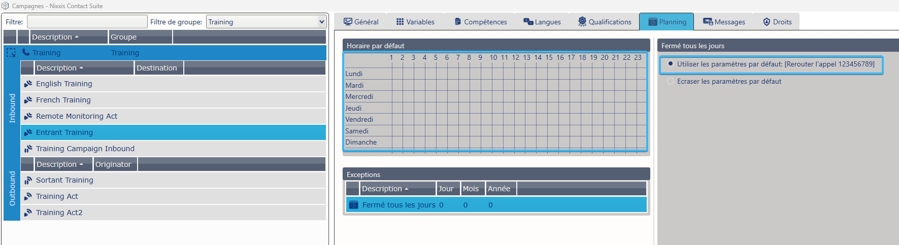Dans certaines configurations, il peut être nécessaire de définir un planning qui reste constamment fermé, par exemple pour désactiver temporairement une activité, rediriger systématiquement les appels, ou appliquer une règle spécifique quel que soit le jour ou l’heure.