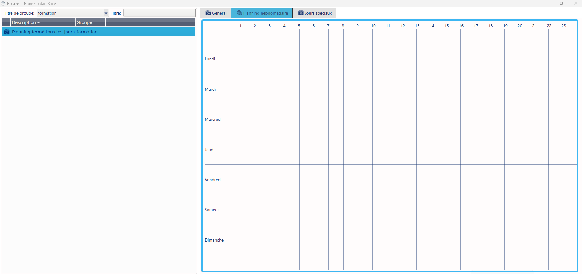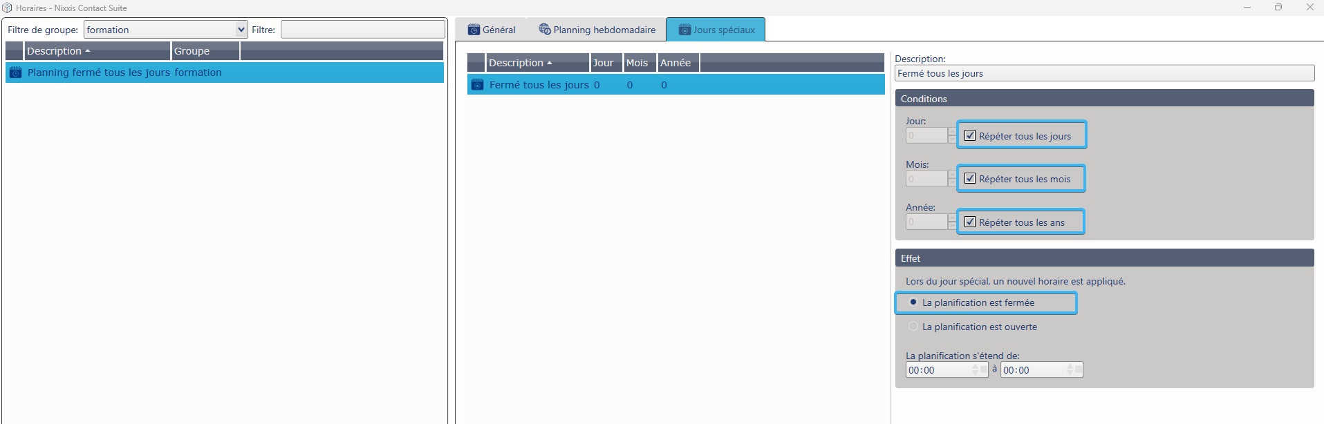 Nixxis Contact Suite permet de créer ce type de planning en utilisant un modèle sans horaires d’ouverture, associé à un jour spécial répété en continu.
