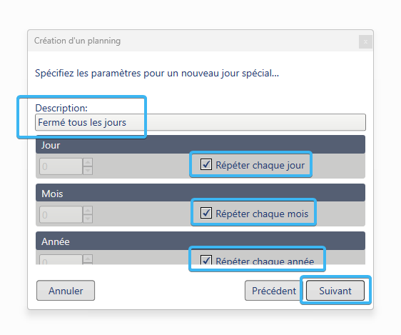 3. Ajouter un nouveau jour spécial dans le contexte du planning sélectionné