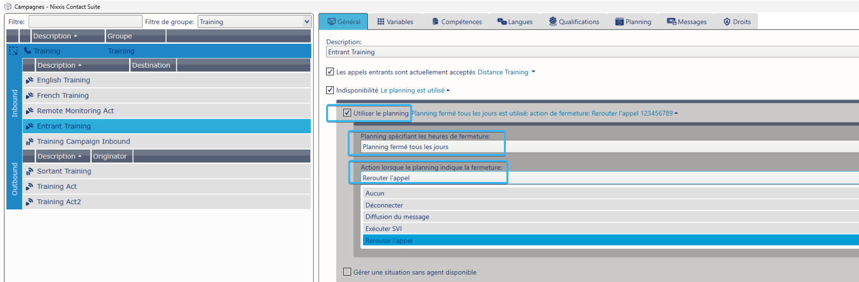7. Le planning peut ainsi être utilisé sur une activité entrante ou sortante afin d'appliquer une action lorsque le planning indique la fermeture - le planning étant toujours fermé quel que soit le jour ou l'heure.