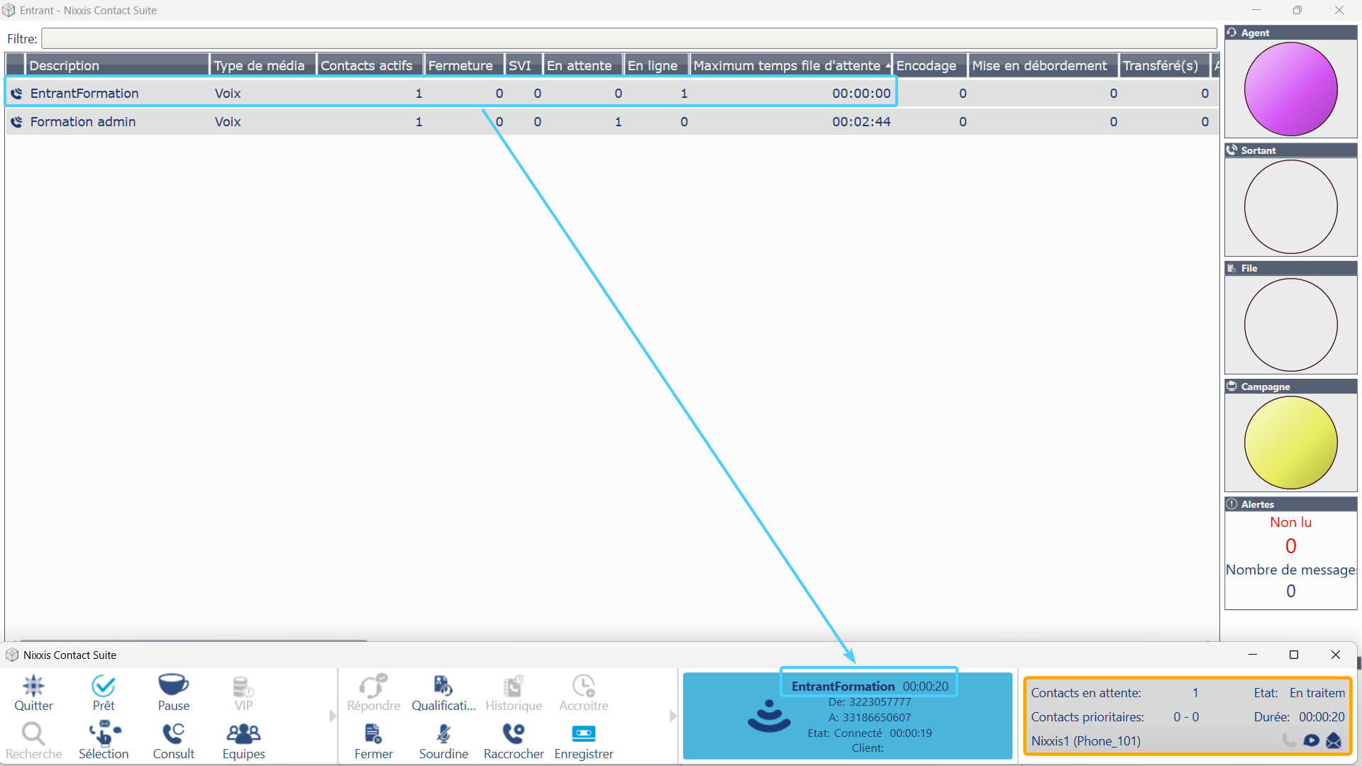 Cette configuration au niveau de la file d'attente utilisée par l'activité entrante donne la possibilité à l’agent de sélectionner et de décrocher un appel entrant dans une file d'attente pour laquelle l’option "Prise de contacts autorisée" est ...